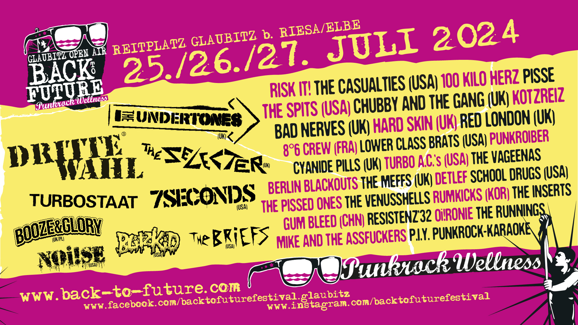 DRITTE WAHL, THE UNDERTONES (UK), THE SELECTER (UK), 7SECONDS (USA), TURBOSTAAT, BOOZE & GLORY (UK/PL), THE BRIEFS (USA), NOi!SE (USA), RISK IT!, BLITZKID (USA), THE CASUALTIES (USA), 100 KILO HERZ, PISSE, THE SPITS (USA), CHUBBY AND THE GANG (UK), KOTZREIZ, BAD NERVES (UK), HARD SKIN (UK), RED LONDON (UK), 8°6 CREW (FRA), LOWER CLASS BRATS (USA), PUNKROIBER, CYANIDE PILLS (UK), TURBO A.C.`s (USA), THE VAGEENAS, BERLIN BLACKOUTS, THE MEFFS (UK), DETLEF, GUM BLEED (CHN), SCHOOL DRUGS (USA), THE PISSED ONES, THE VENUSSHELLS, RUMKICKS (KOR), RESISTENZ`32, Oi!RONIE, DUMMY TOYS (CHN), THE INSERTS, THE RUNNINGS, MIKE AND THE ASSFUCKERS, P.I.Y. PUNKROCK-KARAOKE